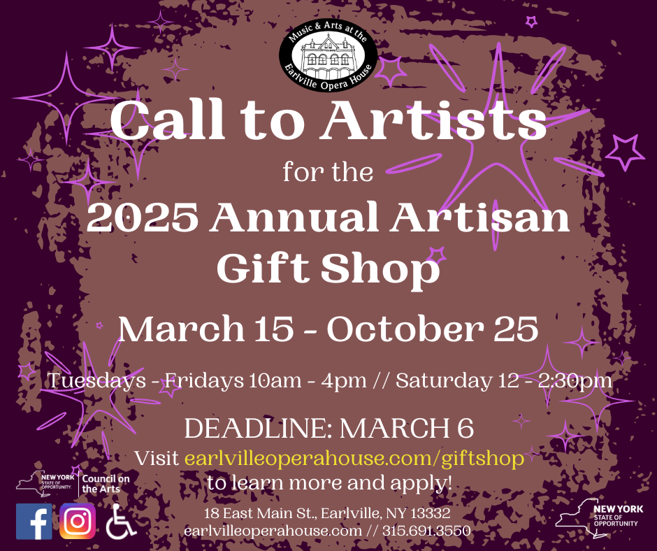 A: The Artist Code is three letters; this is normally the artists initials or the initials of their artist organization. For Example, the Earlville Opera House’s Artist Code is EOH. ** Please note if artist codes overlap, the Earlville Opera House will contact new artists on choosing a new artist code. ** Item Codes are a composite of the Artist Code with two numbers at the end, I.E. EOH01. Artists should label items by similar description and same price value.